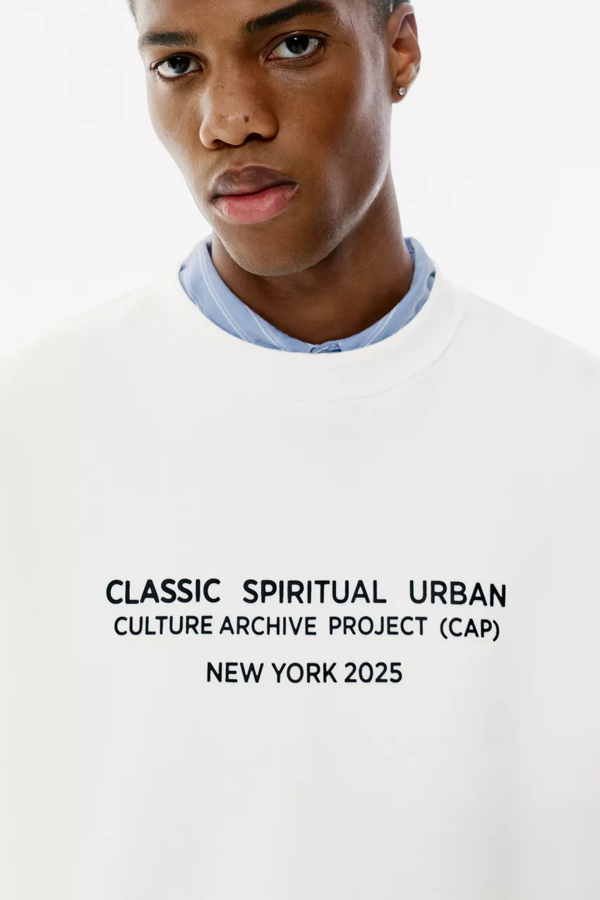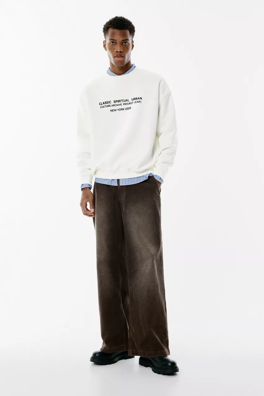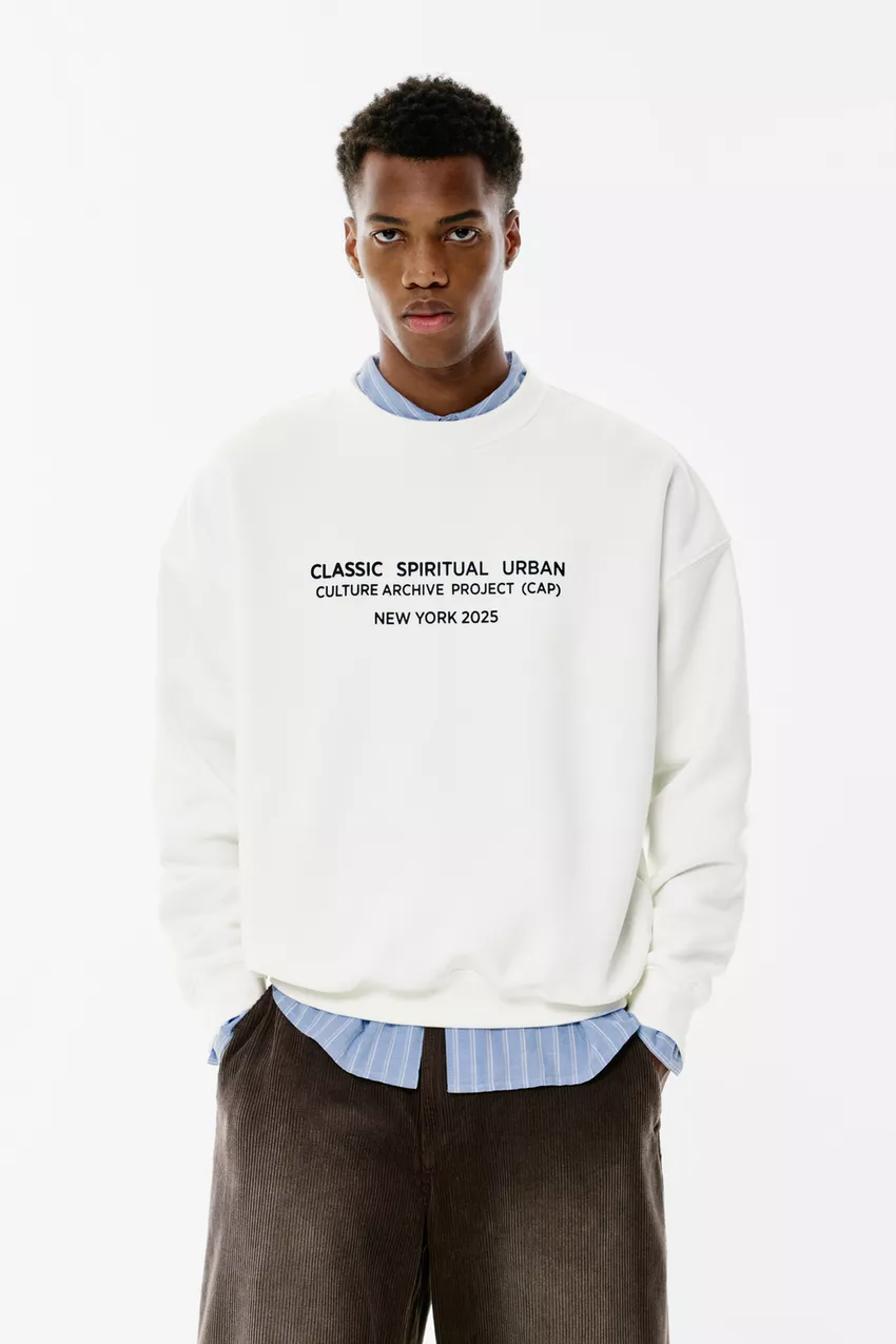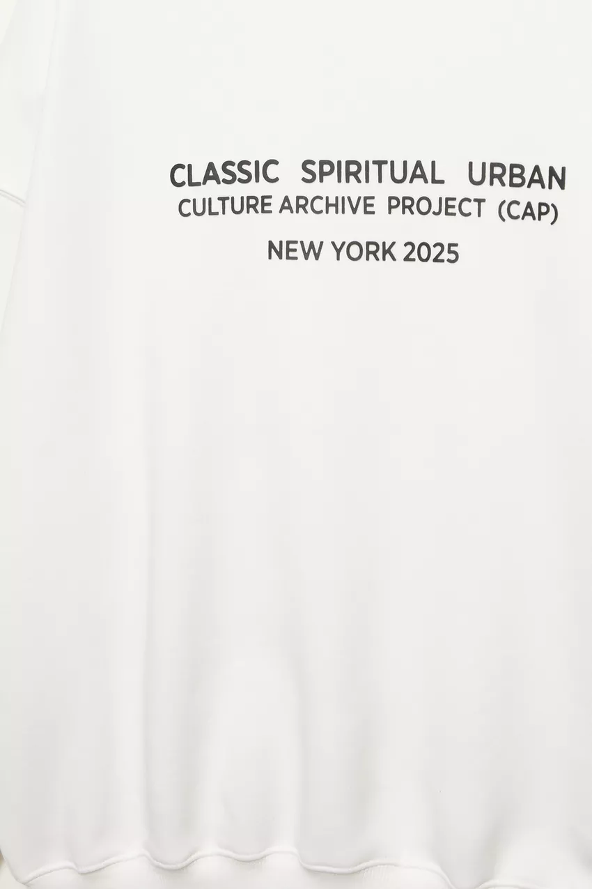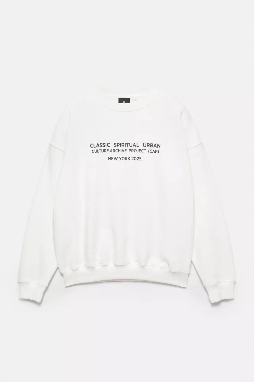 White long sleeve sweatshirt with a contrast slogan on the front and a crew neck. Made of cotton.
